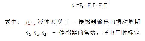 WS3051MD-MM 智能螺紋式單直管密度計(jì)根據(jù)共振原理而設(shè)計(jì)。當(dāng)流過單直管內(nèi)的液體密度變化時(shí),他會(huì)影響密度計(jì)的振動(dòng)質(zhì)量,振動(dòng)質(zhì)量的變化影響單直管的諧振頻率,諧振頻率與過程流體的密度成反比。通過另一個(gè)壓電晶體檢測(cè)出來,通過移相和放大電路,測(cè)量管被穩(wěn)定在自然諧振頻率上。當(dāng)諧振頻率變化時(shí),通過電子處理單元計(jì)算出準(zhǔn)確的密度值。振動(dòng)頻率與密度的關(guān)系為: